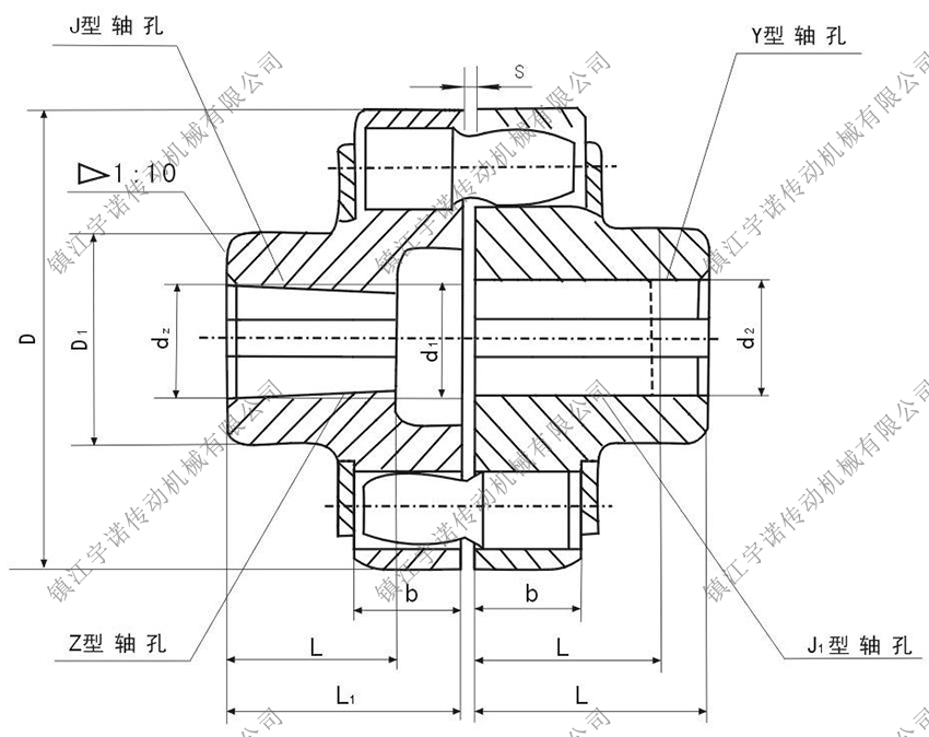 該聯(lián)軸器已列為國家標準GB5014-2003,適用于各種機械聯(lián)接兩同軸線的傳動軸,通常用于動頻繁的高低速運動。工作溫度為-20 ~+80℃;傳遞公稱轉(zhuǎn)矩為250~180000N.m,許用轉(zhuǎn)速為8500~950r/min。軸孔型式有圓柱形(Y)、圓錐形(Z)和短圓柱形(J)。軸孔和鍵槽按國家標準GB3852-83《聯(lián)軸器軸柱和鍵槽形式及尺寸》的規(guī)定加工。